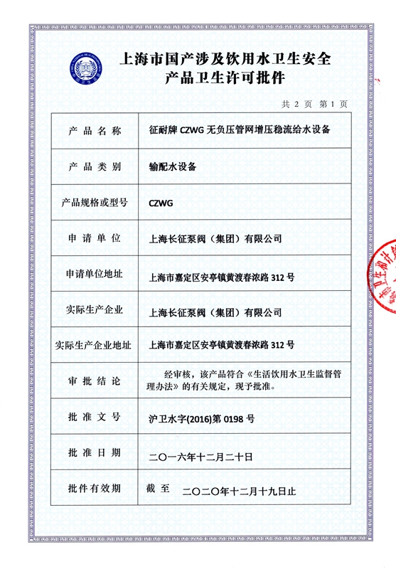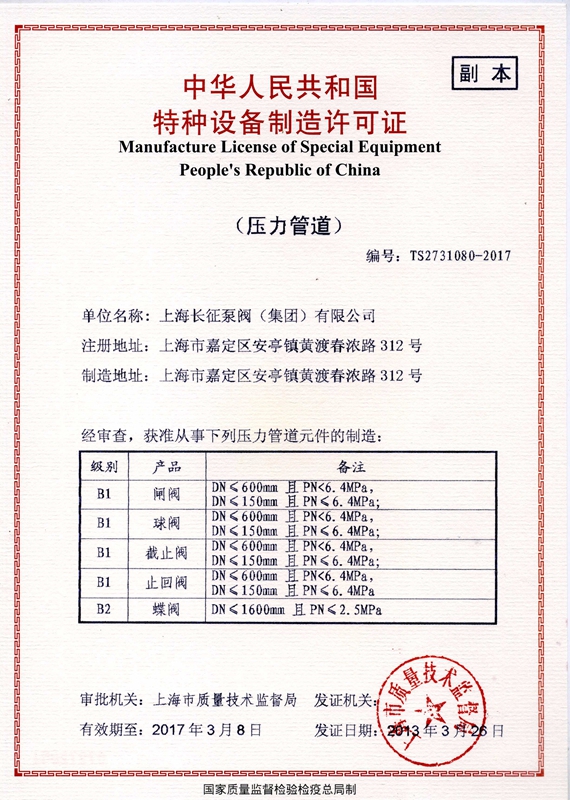 上海長征泵閥(集團)有限公司引進了先進數控機床、加工中心、大型立車、臥式鏜床、國家B等級水泵廠家測試中心、國內一流離心泵生產設備。以下是公司部份資質,點擊可放大查看。